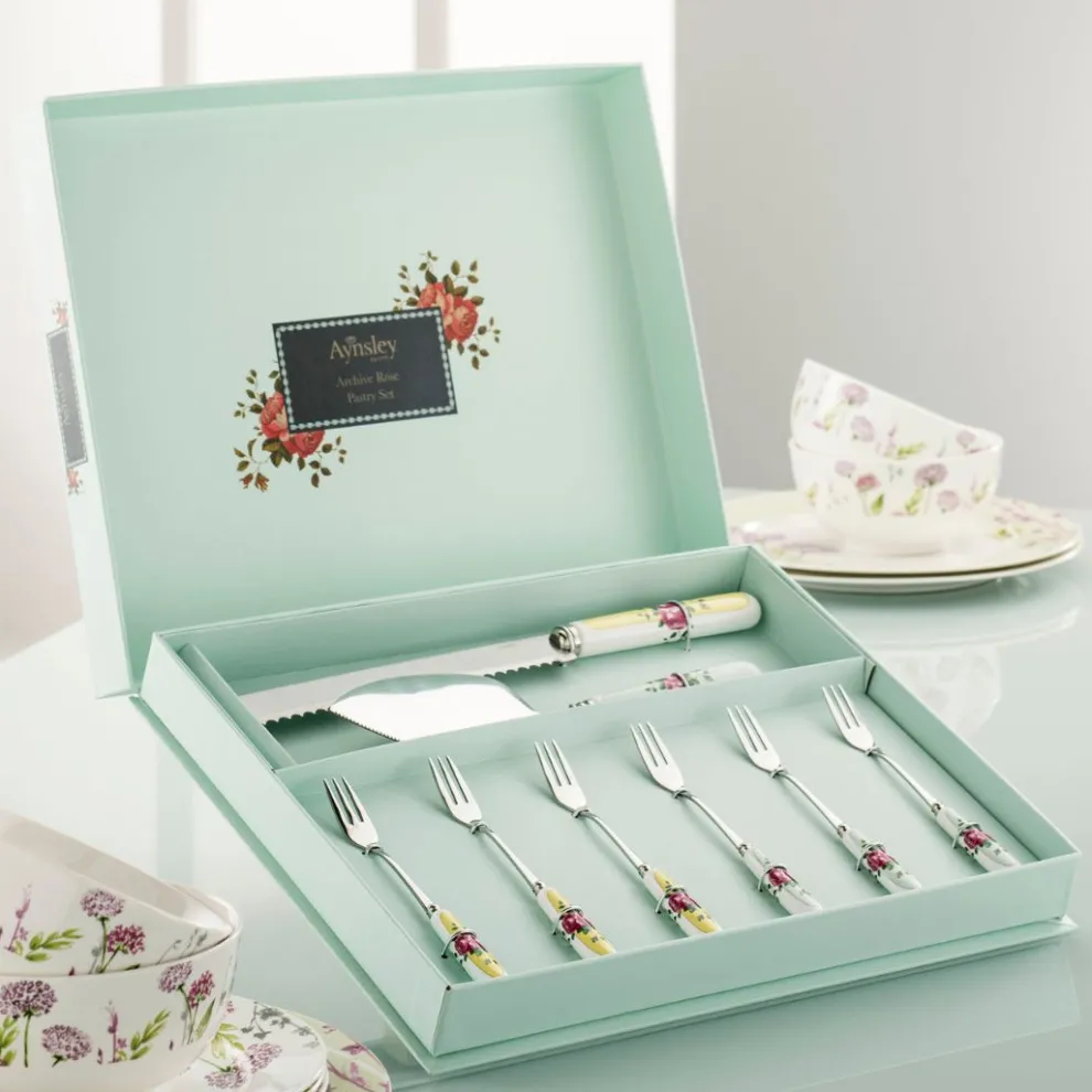 Taking inspiration from the vast archive of artwork from Aynsley’s over 240 year history, the pattern has been re-imagined with contemporary sensibilities. Complete your teaset with these elegant pastry set. This Archive Rose Pastry Set is timeless and classic perfect for any occasion.