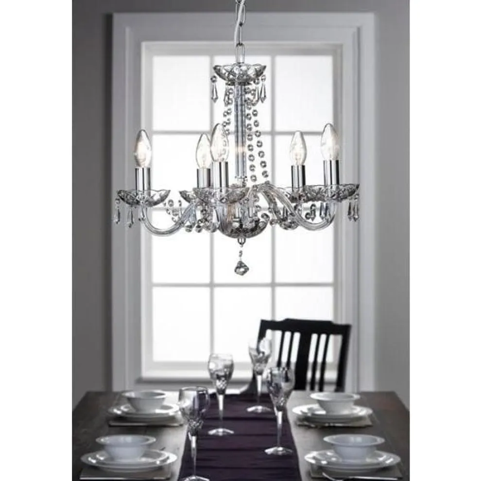 Theenchanting beauty and stylish design of this Cashel 5 Arm Chandelier follows the rest of the Galway Crystal Range of Homeware & Lighting. This is perfect for illuminating smaller to standard size hallways or even above your dining room table.UK/IRE Fitting