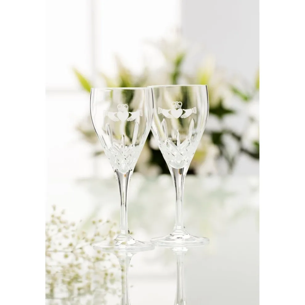 These beautifully craftedCladdagh White Wine Glasses with theiruniqueshape and cut detailarea popularchoice for gift giving. The beautifully cut detail and elegant design incorporates theCladdagh Symbolism. The shape of this glass is designed specifically for white wine and they are sold in pairs. TheCladdagh White Wine make a truly special gift that you will have for years to come.
