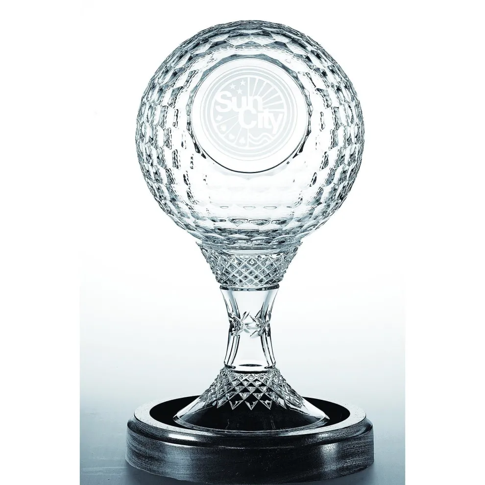 A magnificent Crystal 8″ Golf Ball Trophy. Add a personal message/name & image of your choice! Wooden base is included.