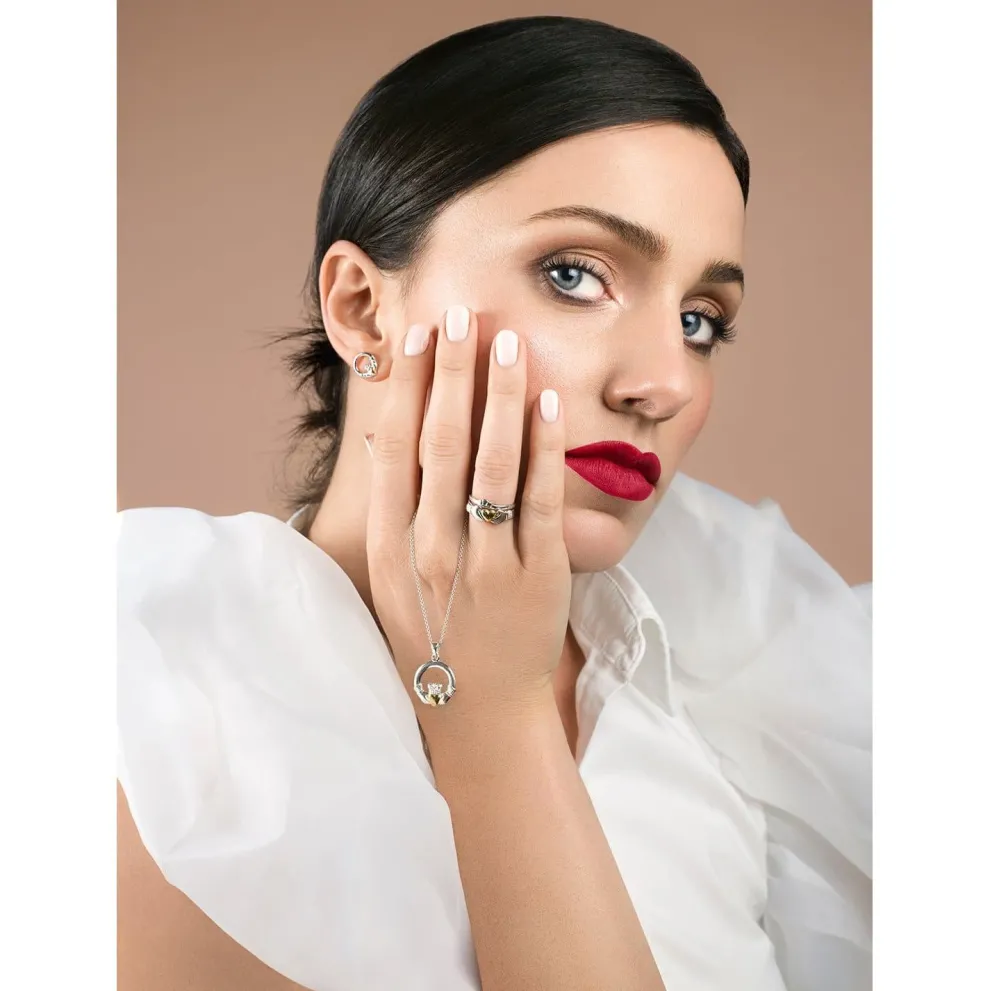 Our CladdaghRingsare perfectfor wearing as an everyday accessory! This beautiful sterling silver trio ringis designed around the Claddagh symbol,symbolisingLove, Loyalty and Friendship. A beautiful mix of sterling silver and gold. Pair it withanother piece from our Claddagh Jewellery Collection. Comes presented in a gift box, perfect for gifting!