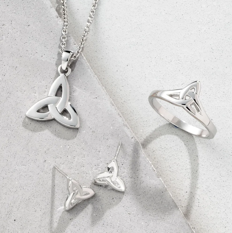 OurSterling SilverTrinity KnotRingsare theperfect every day ring! This beautiful ringis designed around thetraditional Trinity Knotsymbol,exuding Irish charm. Symbolising the Father, the Son and the Holy Spirit. Pair it with the matchingTrinity Knotearrings and pendants. Comes presented in a gift box, perfect for gifting!